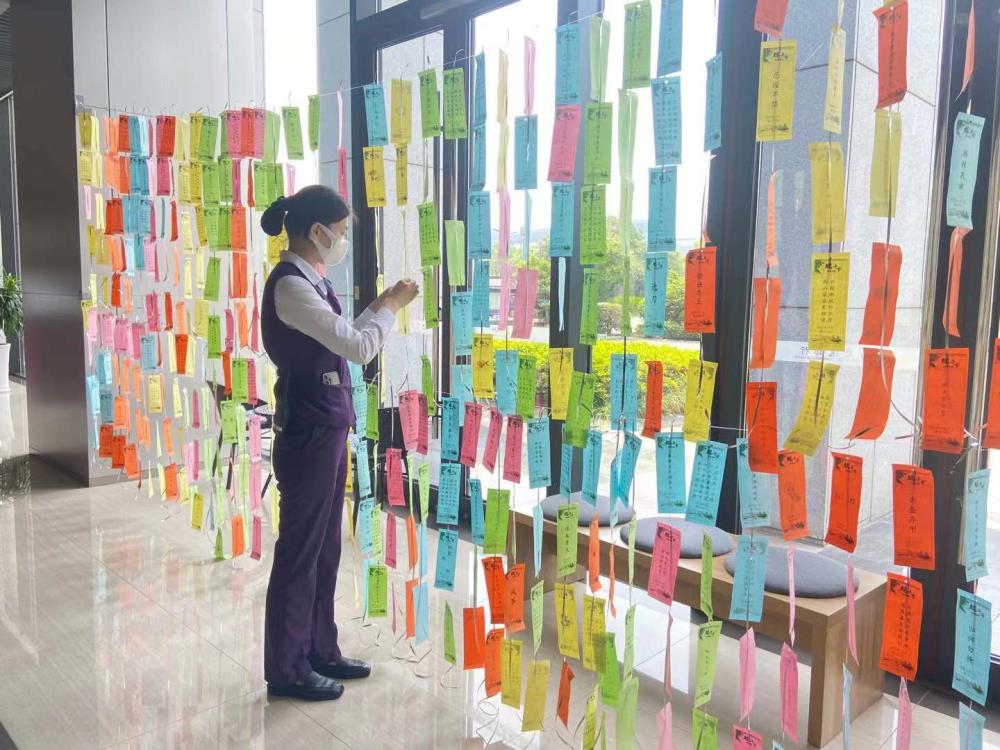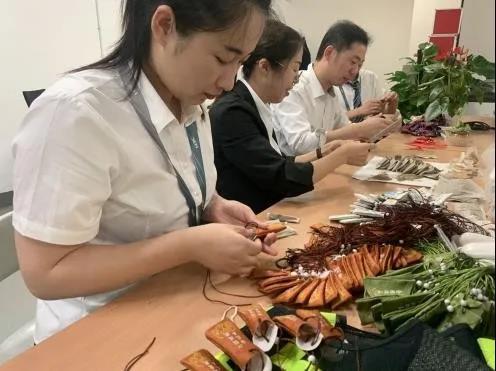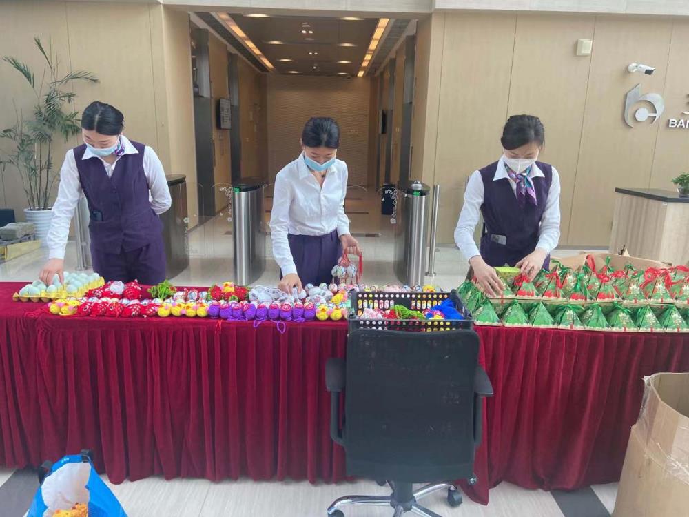 交通银行扬州金融服务中心物业服务处的物业小姐姐们在保障岗位工作的情况下,利用两天时间,完成了1200只粽子的包装、1000只鸭蛋的装网以及1500条五彩绳的编织。6月11日中午安排进行派发,整个园区瞬间洋溢出了浓浓的节日氛围,不少客户不禁举起手机合影、拍照,分享这份“五彩斑斓”的节日惊喜!