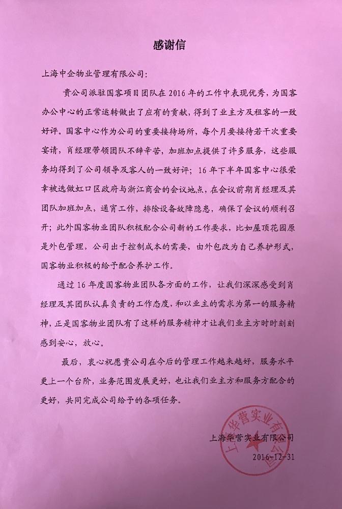 日前,公司总经理办公室收到了来自国客物业服务中心业主方上海华营实业有限公司的一封热情洋溢的感谢信,信中高度赞扬了国客服务中心团队在项目经理肖莉华的带领下不辞辛劳、加班加点、通宵达旦顺利完成了多次重大接待任务,为控制运营成本,主动为业主方分担屋顶花园的日常养护工作,去年一年物业团队时刻以业主方的需求为第一,提供专业、暖心、优质的物业服务,得到业主方认可,让业主方安心、放心。