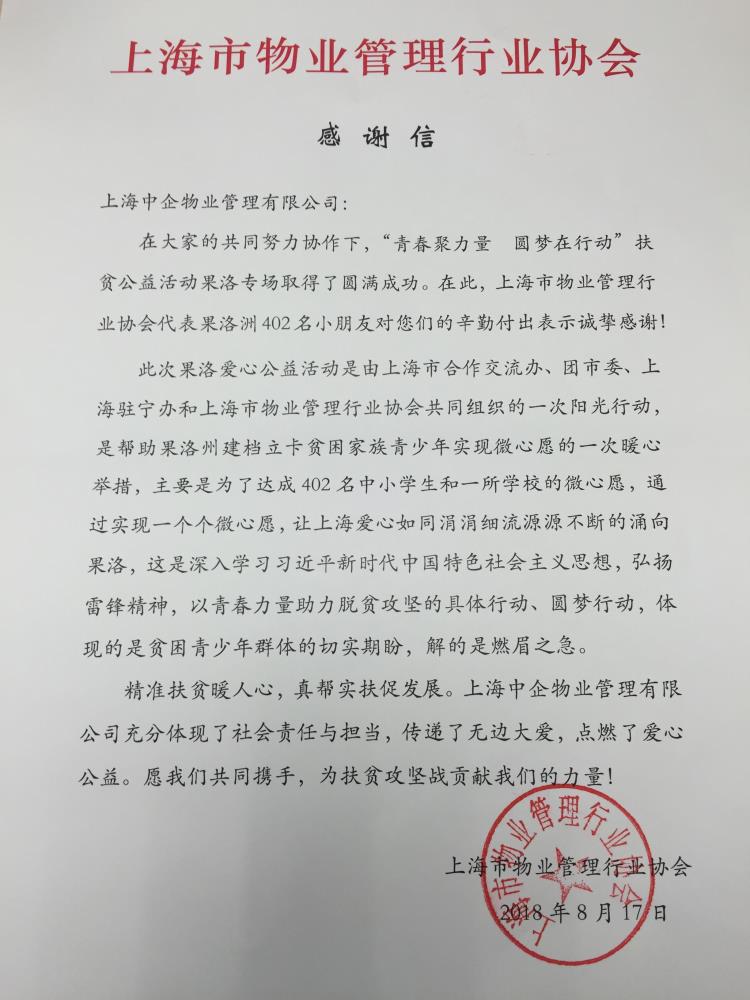 日前,中企物业参与了由共青团上海市委、青海省果洛藏族自治州人民政府、上海市人民政府合作交流办公室领导,上海市人民政府驻西宁办事处、上海市援青干部联络组、共青团上海市合作交流工作委员会、上海市慈善基金会、上海青年志愿者协会联合举办的青海省果洛藏族自治州专场“青春聚力量、圆梦在行动”公益扶贫活动,青海果洛州专场聚焦当地402名困难学生,为他们实现微心愿。中企物业作为行业领先企业,充分体现了社会责任与担当,用实际行动为果洛州402名小朋友献出爱心,或许只是一个书 包、一套复习资料、一个足球、一套运动服,但我们相信点滴汇聚必成大爱,希望果洛州的孩子们把小小爱心埋于心中,健康快乐地慢慢长大。
