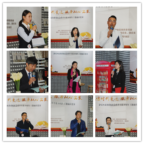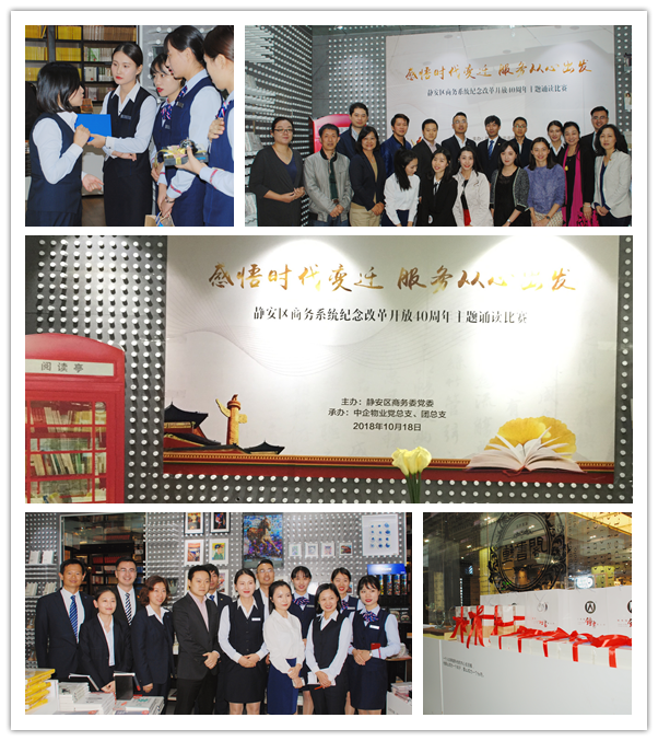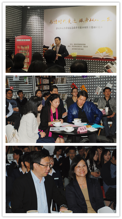 10月18日,由静安区商务委党委主办、上海中企物业管理有限公司承办的“感悟时代变迁 服务从心出发”纪念改革开放40周年诵读活动,在美丽静安的最美书店钟书阁展开了决赛对战。静安区商务委党委副书记丁巍、静安区商务委组织人事科科长杜惠华,中企物业党总支书记、董事长朱建华,中企物业总经理严镔贤,梅龙镇集团党委副书记孙来宝、上海城市国际企业发展有限公司党总支书记王晓莹受邀出席,为保证比赛水平与质量,比赛特邀三位专家评委老师亲临现场指导,分别是来自静安区语委办副主任、国家级普通话水平测试员、上海市朗诵艺术等级考官庞燕,资深导演、上海戏剧学院客座讲师石磊,黄浦区语委办副主任、国家级普通话水平测试员、上海市朗诵艺术等级考官陈宏。