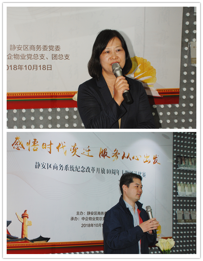 活动最后,主办方特邀静安区商务委组织人事科科长杜惠华和中企物业党总支书记、董事长朱建华作总结发言。朱董结合自己在改革开放四十年中特别的经历现场分享,高度认可和赞扬了诵读比赛活动,杜科长表示此类富有意义的文艺性质比赛,让人能够在浮躁的社会中静下心去思考和感受,以后要多多策划。