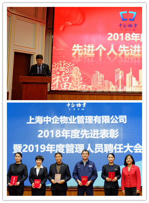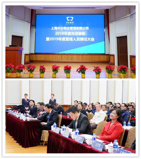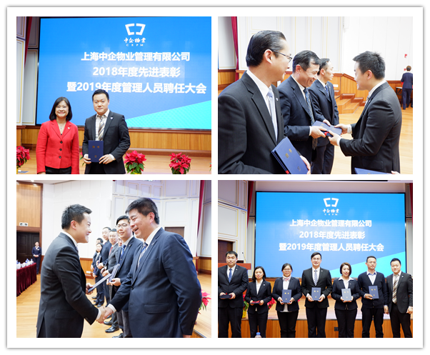 1月18日,中企物业2018年度先进表彰暨2019年度管理人员聘任大会在上海市医学会三楼报告厅召开,公司高层、管理团队、项目经理,以及表彰和聘任对象等相关人员齐聚一堂,共同回顾过去、展望未来。大会于下午14时拉开序幕,由公司副总经理刘真清主持,刘总简短介绍了此次大会的议程:“今天我们相聚在这里,召开中企物业一年一度的表彰聘任大会,总结2018年全年工作,对这一年中表现突出的先进个人和团队进行表彰,同时对新年工作提出规划和部署,向管理人员颁发聘书。”