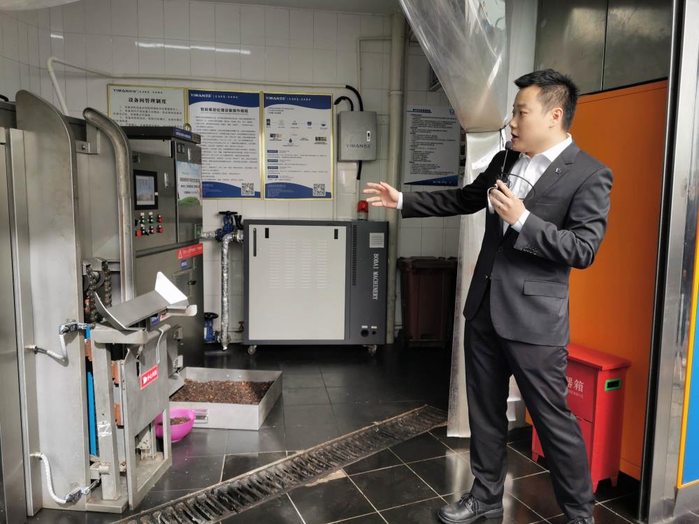考察团一行参观了位于静安中华大厦后门处的垃圾收集分类站和大楼楼层里的垃圾房,中企物业总经理严镔贤现场介绍了分类站的“高级功能”。除了一台设有干垃圾、有害垃圾、可回收物等不同种类垃圾投递窗口的智能垃圾分类回收设备外,还特别配备了一套智能湿垃圾处理设备,通过进料、压缩、排水、烘干处理后,就能成为有机肥料。在楼层垃圾房内,则分别放置了一个60升的湿垃圾桶、一个100升的干垃圾桶、一个100升的可回收垃圾桶和一个用于投放有毒有害垃圾的小篓子。此外,中企物业还贴心地为每个垃圾房安装了一个洗碗池,方便自己带饭的白领洗碗,细致之处,彰显优质服务和高效管理。